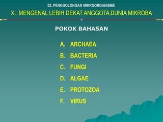 Bakteria 3Protozoa 5Alga 2Virus 4Kulat 91 Pengelasan Mikroorganisma Virus Ciri Huraian Rupa bentuk Bukan sel hidup Tidak mempunyai nukleus sitoplasma membran sel dan dinding sel Terdiri daripada lapisan protein dan bahan baka Saiz Mikroorganisma paling seni kerana boleh melalui penapis porselin. The smallest among all microorganisms is protozoa. Laman web video kurikulum.